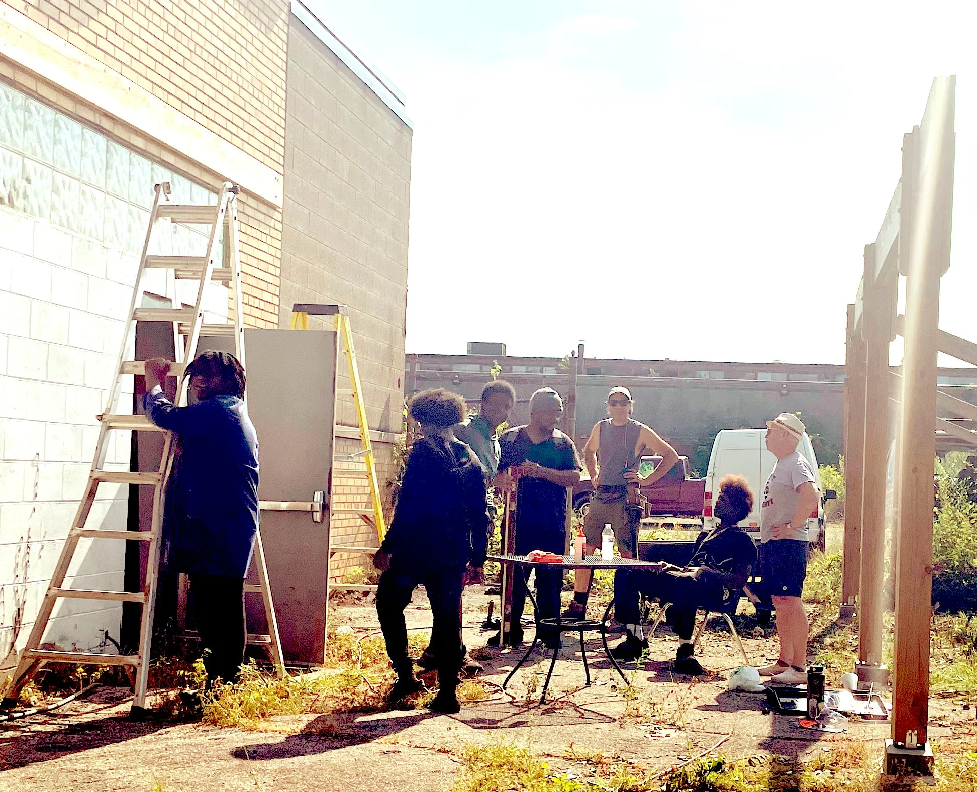 Jayshawn Young, DCHS graduate and Brightmoor Maker Instructor, displays his mastery of the wood chisel lettering upon a large sign commission.